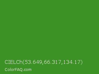 CIELCh 53.649,66.317,134.17 Color is a normal green color and the nearest color is La Palma #368716. Hex code #3c9224 and RGB value is rgb(60,146,36). In RGB color space, this color is composed of 24% red, 57% green, 14% blue, In CMYK color space, this color is composed of 59% cyan, 0% magenta, 75% yellow , 43% black , In HSL color space, this color has a hue angle of 107° , 60% saturation and 36% lightness.