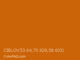 CIELCh 53.64,70.929,58.603 Color is a normal orange color and the nearest color is Red Stage #d05f04. Hex code #cb6308 and RGB value is rgb(203,99,8). In RGB color space, this color is composed of 80% red, 39% green, 3% blue, In CMYK color space, this color is composed of 0% cyan, 51% magenta, 96% yellow , 20% black , In HSL color space, this color has a hue angle of 28° , 92% saturation and 41% lightness.