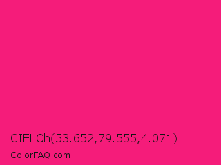 CIELCh 53.652,79.555,4.071 Color is a normal rose color and the nearest color is Razzmatazz #e3256b. Hex code #f51c7a and RGB value is rgb(245,28,122). In RGB color space, this color is composed of 96% red, 11% green, 48% blue, In CMYK color space, this color is composed of 0% cyan, 89% magenta, 50% yellow , 4% black , In HSL color space, this color has a hue angle of 334° , 92% saturation and 54% lightness.