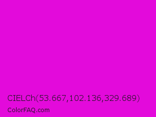 CIELCh 53.667,102.136,329.689 Color is a normal magenta color and the nearest color is Deep Magenta #cc00cc. Hex code #e30adb and RGB value is rgb(227,10,219). In RGB color space, this color is composed of 89% red, 4% green, 86% blue, In CMYK color space, this color is composed of 0% cyan, 96% magenta, 4% yellow , 11% black , In HSL color space, this color has a hue angle of 302° , 92% saturation and 46% lightness.