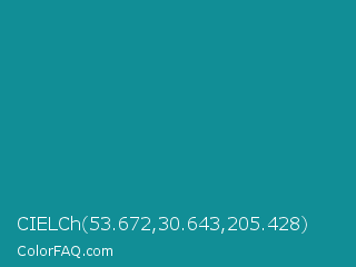 CIELCh 53.672,30.643,205.428 Color is a normal cyan color and the nearest color is Blue Chill #0c8990. Hex code #118e96 and RGB value is rgb(17,142,150). In RGB color space, this color is composed of 7% red, 56% green, 59% blue, In CMYK color space, this color is composed of 89% cyan, 5% magenta, 0% yellow , 41% black , In HSL color space, this color has a hue angle of 184° , 80% saturation and 33% lightness.