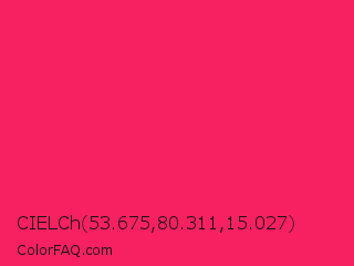 CIELCh 53.675,80.311,15.027 Color is a normal rose color and the nearest color is Awesome #ff2052. Hex code #f72061 and RGB value is rgb(247,32,97). In RGB color space, this color is composed of 97% red, 13% green, 38% blue, In CMYK color space, this color is composed of 0% cyan, 87% magenta, 61% yellow , 3% black , In HSL color space, this color has a hue angle of 342° , 93% saturation and 55% lightness.