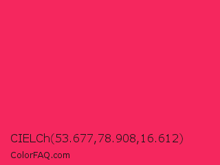 CIELCh 53.677,78.908,16.612 Color is a normal rose color and the nearest color is Awesome #ff2052. Hex code #f5275e and RGB value is rgb(245,39,94). In RGB color space, this color is composed of 96% red, 15% green, 37% blue, In CMYK color space, this color is composed of 0% cyan, 84% magenta, 62% yellow , 4% black , In HSL color space, this color has a hue angle of 344° , 91% saturation and 56% lightness.
