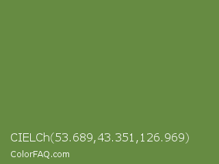 CIELCh 53.689,43.351,126.969 Color is a normal green color and the nearest color is Palm Leaf #6f9940. Hex code #668b42 and RGB value is rgb(102,139,66). In RGB color space, this color is composed of 40% red, 55% green, 26% blue, In CMYK color space, this color is composed of 27% cyan, 0% magenta, 53% yellow , 45% black , In HSL color space, this color has a hue angle of 90° , 36% saturation and 40% lightness.