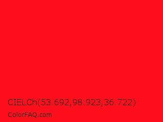 CIELCh 53.692,98.923,36.722 Color is a normal red color and the nearest color is Vivid Red #f70d1a. Hex code #ff0f1c and RGB value is rgb(255,15,28). In RGB color space, this color is composed of 100% red, 6% green, 11% blue, In CMYK color space, this color is composed of 0% cyan, 94% magenta, 89% yellow , 0% black , In HSL color space, this color has a hue angle of 357° , 100% saturation and 53% lightness.