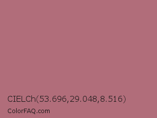 CIELCh 53.696,29.048,8.516 Color is a normal red color and the nearest color is Rose Gold #b76e79. Hex code #b16d7a and RGB value is rgb(177,109,122). In RGB color space, this color is composed of 69% red, 43% green, 48% blue, In CMYK color space, this color is composed of 0% cyan, 38% magenta, 31% yellow , 31% black , In HSL color space, this color has a hue angle of 349° , 30% saturation and 56% lightness.