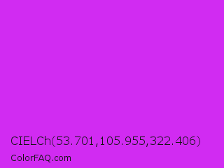 CIELCh 53.701,105.955,322.406 Color is a normal purple color and the nearest color is Steel Pink #cc33cc. Hex code #d12bf2 and RGB value is rgb(209,43,242). In RGB color space, this color is composed of 82% red, 17% green, 95% blue, In CMYK color space, this color is composed of 14% cyan, 82% magenta, 0% yellow , 5% black , In HSL color space, this color has a hue angle of 290° , 88% saturation and 56% lightness.