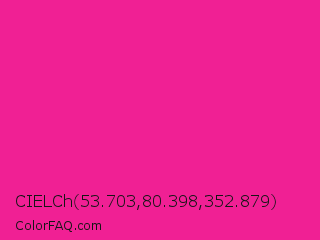 CIELCh 53.703,80.398,352.879 Color is a normal magenta color and the nearest color is Barbie Pink #e0218a. Hex code #f02094 and RGB value is rgb(240,32,148). In RGB color space, this color is composed of 94% red, 13% green, 58% blue, In CMYK color space, this color is composed of 0% cyan, 87% magenta, 38% yellow , 6% black , In HSL color space, this color has a hue angle of 327° , 87% saturation and 53% lightness.