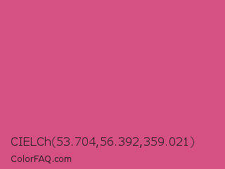 CIELCh 53.704,56.392,359.021 Color is a normal rose color and the nearest color is Mystic #d65282. Hex code #d55184 and RGB value is rgb(213,81,132). In RGB color space, this color is composed of 84% red, 32% green, 52% blue, In CMYK color space, this color is composed of 0% cyan, 62% magenta, 38% yellow , 16% black , In HSL color space, this color has a hue angle of 337° , 61% saturation and 58% lightness.
