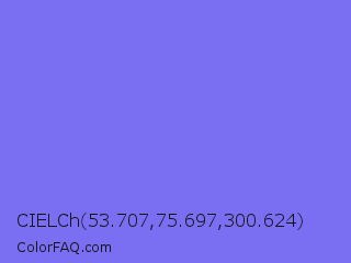 CIELCh 53.707,75.697,300.624 Color is a light indigo color and the nearest color is Medium Slate Blue #7b68ee. Hex code #7a6ef2 and RGB value is rgb(122,110,242). In RGB color space, this color is composed of 48% red, 43% green, 95% blue, In CMYK color space, this color is composed of 50% cyan, 55% magenta, 0% yellow , 5% black , In HSL color space, this color has a hue angle of 245° , 84% saturation and 69% lightness.