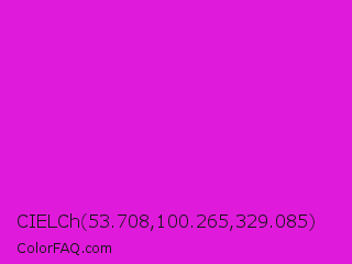 CIELCh 53.708,100.265,329.085 Color is a normal magenta color and the nearest color is Hot Magenta #ff1dce. Hex code #e01adb and RGB value is rgb(224,26,219). In RGB color space, this color is composed of 88% red, 10% green, 86% blue, In CMYK color space, this color is composed of 0% cyan, 88% magenta, 2% yellow , 12% black , In HSL color space, this color has a hue angle of 302° , 79% saturation and 49% lightness.