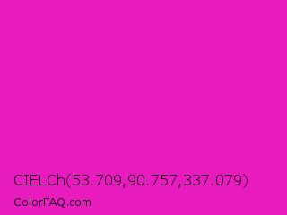 CIELCh 53.709,90.757,337.079 Color is a normal magenta color and the nearest color is Shocking Pink #fc0fc0. Hex code #e81bbf and RGB value is rgb(232,27,191). In RGB color space, this color is composed of 91% red, 11% green, 75% blue, In CMYK color space, this color is composed of 0% cyan, 88% magenta, 18% yellow , 9% black , In HSL color space, this color has a hue angle of 312° , 82% saturation and 51% lightness.