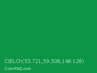 CIELCh 53.721,59.508,148.128 Color is a normal green color and the nearest color is Spanish Green #009150. Hex code #0c9447 and RGB value is rgb(12,148,71). In RGB color space, this color is composed of 5% red, 58% green, 28% blue, In CMYK color space, this color is composed of 92% cyan, 0% magenta, 52% yellow , 42% black , In HSL color space, this color has a hue angle of 146° , 85% saturation and 31% lightness.