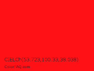 CIELCh 53.723,100.33,38.038 Color is a normal red color and the nearest color is Vivid Red #f70d1a. Hex code #ff1115 and RGB value is rgb(255,17,21). In RGB color space, this color is composed of 100% red, 7% green, 8% blue, In CMYK color space, this color is composed of 0% cyan, 93% magenta, 92% yellow , 0% black , In HSL color space, this color has a hue angle of 359° , 100% saturation and 53% lightness.