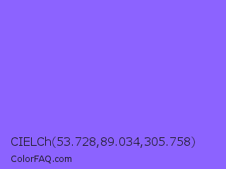 CIELCh 53.728,89.034,305.758 Color is a light indigo color and the nearest color is Medium Slate Blue #7b68ee. Hex code #8c63ff and RGB value is rgb(140,99,255). In RGB color space, this color is composed of 55% red, 39% green, 100% blue, In CMYK color space, this color is composed of 45% cyan, 61% magenta, 0% yellow , 0% black , In HSL color space, this color has a hue angle of 256° , 100% saturation and 69% lightness.