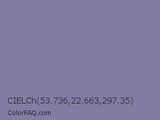 CIELCh 53.736,22.663,297.35 Color is a normal indigo color and the nearest color is Waterloo #7b7c94. Hex code #817ca3 and RGB value is rgb(129,124,163). In RGB color space, this color is composed of 51% red, 49% green, 64% blue, In CMYK color space, this color is composed of 21% cyan, 24% magenta, 0% yellow , 36% black , In HSL color space, this color has a hue angle of 248° , 17% saturation and 56% lightness.