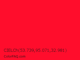 CIELCh 53.739,95.071,32.981 Color is a normal red color and the nearest color is Torch Red #fd0e35. Hex code #ff0d2c and RGB value is rgb(255,13,44). In RGB color space, this color is composed of 100% red, 5% green, 17% blue, In CMYK color space, this color is composed of 0% cyan, 95% magenta, 83% yellow , 0% black , In HSL color space, this color has a hue angle of 352° , 100% saturation and 53% lightness.