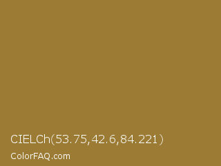 CIELCh 53.75,42.6,84.221 Color is a normal orange color and the nearest color is Metallic Sunburst #9c7c38. Hex code #9c7c35 and RGB value is rgb(156,124,53). In RGB color space, this color is composed of 61% red, 49% green, 21% blue, In CMYK color space, this color is composed of 0% cyan, 21% magenta, 66% yellow , 39% black , In HSL color space, this color has a hue angle of 41° , 49% saturation and 41% lightness.