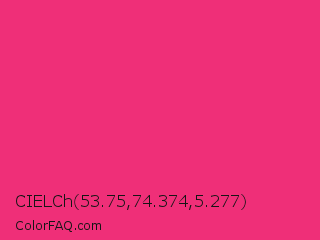 CIELCh 53.75,74.374,5.277 Color is a normal rose color and the nearest color is Cerise Pink #ec3b83. Hex code #ef2f78 and RGB value is rgb(239,47,120). In RGB color space, this color is composed of 94% red, 18% green, 47% blue, In CMYK color space, this color is composed of 0% cyan, 80% magenta, 50% yellow , 6% black , In HSL color space, this color has a hue angle of 337° , 86% saturation and 56% lightness.