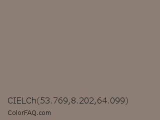 CIELCh 53.769,8.202,64.099 Color is a normal orange color and the nearest color is Squirrel #8f8176. Hex code #8c7e74 and RGB value is rgb(140,126,116). In RGB color space, this color is composed of 55% red, 49% green, 45% blue, In CMYK color space, this color is composed of 0% cyan, 10% magenta, 17% yellow , 45% black , In HSL color space, this color has a hue angle of 25° , 9% saturation and 50% lightness.