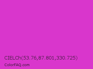 CIELCh 53.76,87.801,330.725 Color is a normal magenta color and the nearest color is Steel Pink #cc33cc. Hex code #d936cc and RGB value is rgb(217,54,204). In RGB color space, this color is composed of 85% red, 21% green, 80% blue, In CMYK color space, this color is composed of 0% cyan, 75% magenta, 6% yellow , 15% black , In HSL color space, this color has a hue angle of 305° , 68% saturation and 53% lightness.