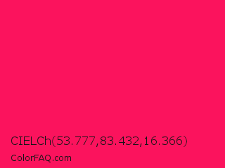 CIELCh 53.777,83.432,16.366 Color is a normal rose color and the nearest color is Awesome #ff2052. Hex code #fb135d and RGB value is rgb(251,19,93). In RGB color space, this color is composed of 98% red, 7% green, 36% blue, In CMYK color space, this color is composed of 0% cyan, 92% magenta, 63% yellow , 2% black , In HSL color space, this color has a hue angle of 341° , 97% saturation and 53% lightness.