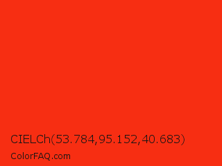 CIELCh 53.784,95.152,40.683 Color is a normal red color and the nearest color is Red RYB #fe2712. Hex code #f72e12 and RGB value is rgb(247,46,18). In RGB color space, this color is composed of 97% red, 18% green, 7% blue, In CMYK color space, this color is composed of 0% cyan, 81% magenta, 93% yellow , 3% black , In HSL color space, this color has a hue angle of 7° , 93% saturation and 52% lightness.