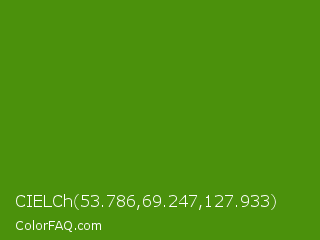 CIELCh 53.786,69.247,127.933 Color is a normal green color and the nearest color is Vida Loca #549019. Hex code #4b910c and RGB value is rgb(75,145,12). In RGB color space, this color is composed of 29% red, 57% green, 5% blue, In CMYK color space, this color is composed of 48% cyan, 0% magenta, 92% yellow , 43% black , In HSL color space, this color has a hue angle of 92° , 85% saturation and 31% lightness.