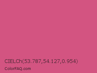 CIELCh 53.787,54.127,0.954 Color is a normal rose color and the nearest color is Mystic #d65282. Hex code #d35481 and RGB value is rgb(211,84,129). In RGB color space, this color is composed of 83% red, 33% green, 51% blue, In CMYK color space, this color is composed of 0% cyan, 60% magenta, 39% yellow , 17% black , In HSL color space, this color has a hue angle of 339° , 59% saturation and 58% lightness.