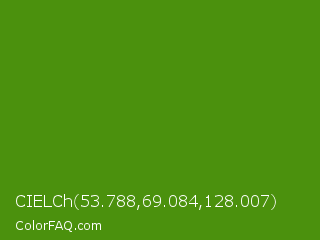 CIELCh 53.788,69.084,128.007 Color is a normal green color and the nearest color is Vida Loca #549019. Hex code #4b910d and RGB value is rgb(75,145,13). In RGB color space, this color is composed of 29% red, 57% green, 5% blue, In CMYK color space, this color is composed of 48% cyan, 0% magenta, 91% yellow , 43% black , In HSL color space, this color has a hue angle of 92° , 84% saturation and 31% lightness.