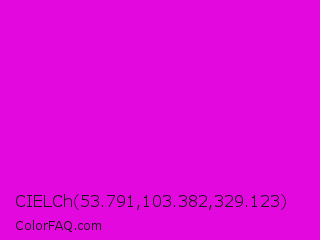CIELCh 53.791,103.382,329.123 Color is a normal magenta color and the nearest color is Deep Magenta #cc00cc. Hex code #e308de and RGB value is rgb(227,8,222). In RGB color space, this color is composed of 89% red, 3% green, 87% blue, In CMYK color space, this color is composed of 0% cyan, 96% magenta, 2% yellow , 11% black , In HSL color space, this color has a hue angle of 301° , 93% saturation and 46% lightness.
