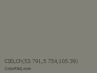 CIELCh 53.791,5.754,105.39 Color is a normal yellow color and the nearest color is Friar Gray #807e79. Hex code #828177 and RGB value is rgb(130,129,119). In RGB color space, this color is composed of 51% red, 51% green, 47% blue, In CMYK color space, this color is composed of 0% cyan, 1% magenta, 8% yellow , 49% black , In HSL color space, this color has a hue angle of 55° , 4% saturation and 49% lightness.