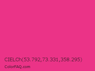 CIELCh 53.792,73.331,358.295 Color is a normal rose color and the nearest color is Cerise Pink #ec3b83. Hex code #eb3387 and RGB value is rgb(235,51,135). In RGB color space, this color is composed of 92% red, 20% green, 53% blue, In CMYK color space, this color is composed of 0% cyan, 78% magenta, 43% yellow , 8% black , In HSL color space, this color has a hue angle of 333° , 82% saturation and 56% lightness.