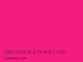 CIELCh 53.816,79.843,1.632 Color is a normal rose color and the nearest color is Fluorescent Pink #ff1493. Hex code #f51c80 and RGB value is rgb(245,28,128). In RGB color space, this color is composed of 96% red, 11% green, 50% blue, In CMYK color space, this color is composed of 0% cyan, 89% magenta, 48% yellow , 4% black , In HSL color space, this color has a hue angle of 332° , 92% saturation and 54% lightness.