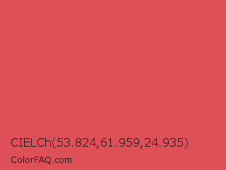 CIELCh 53.824,61.959,24.935 Color is a normal red color and the nearest color is Mandy #e25465. Hex code #de4f57 and RGB value is rgb(222,79,87). In RGB color space, this color is composed of 87% red, 31% green, 34% blue, In CMYK color space, this color is composed of 0% cyan, 64% magenta, 61% yellow , 13% black , In HSL color space, this color has a hue angle of 357° , 68% saturation and 59% lightness.