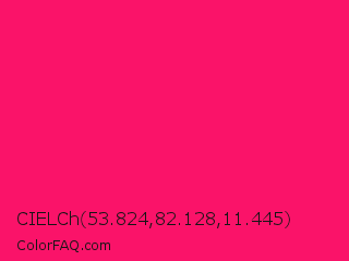 CIELCh 53.824,82.128,11.445 Color is a normal rose color and the nearest color is Vivid Raspberry #ff006c. Hex code #fa1369 and RGB value is rgb(250,19,105). In RGB color space, this color is composed of 98% red, 7% green, 41% blue, In CMYK color space, this color is composed of 0% cyan, 92% magenta, 58% yellow , 2% black , In HSL color space, this color has a hue angle of 338° , 96% saturation and 53% lightness.