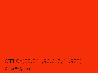 CIELCh 53.841,96.617,41.972 Color is a normal red color and the nearest color is Ferrari Red #ff2800. Hex code #f72f08 and RGB value is rgb(247,47,8). In RGB color space, this color is composed of 97% red, 18% green, 3% blue, In CMYK color space, this color is composed of 0% cyan, 81% magenta, 97% yellow , 3% black , In HSL color space, this color has a hue angle of 10° , 94% saturation and 50% lightness.