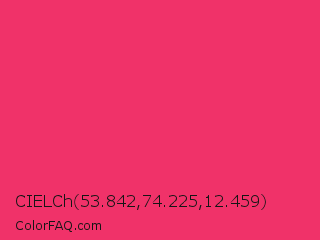 CIELCh 53.842,74.225,12.459 Color is a normal rose color and the nearest color is Paradise Pink #e63e62. Hex code #f03269 and RGB value is rgb(240,50,105). In RGB color space, this color is composed of 94% red, 20% green, 41% blue, In CMYK color space, this color is composed of 0% cyan, 79% magenta, 56% yellow , 6% black , In HSL color space, this color has a hue angle of 343° , 86% saturation and 57% lightness.