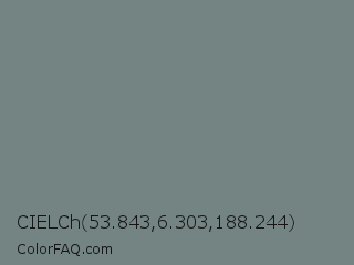 CIELCh 53.843,6.303,188.244 Color is a normal cyan color and the nearest color is Blue Smoke #748881. Hex code #748482 and RGB value is rgb(116,132,130). In RGB color space, this color is composed of 45% red, 52% green, 51% blue, In CMYK color space, this color is composed of 12% cyan, 0% magenta, 2% yellow , 48% black , In HSL color space, this color has a hue angle of 173° , 6% saturation and 49% lightness.