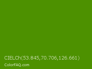 CIELCh 53.845,70.706,126.661 Color is a dark green color and the nearest color is Avocado #568203. Hex code #4d9100 and RGB value is rgb(77,145,0). In RGB color space, this color is composed of 30% red, 57% green, 0% blue, In CMYK color space, this color is composed of 47% cyan, 0% magenta, 100% yellow , 43% black , In HSL color space, this color has a hue angle of 88° , 100% saturation and 28% lightness.