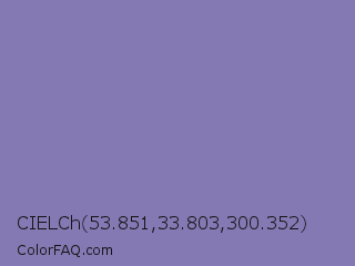 CIELCh 53.851,33.803,300.352 Color is a normal indigo color and the nearest color is Middle Blue Purple #8b72be. Hex code #8479b3 and RGB value is rgb(132,121,179). In RGB color space, this color is composed of 52% red, 47% green, 70% blue, In CMYK color space, this color is composed of 26% cyan, 32% magenta, 0% yellow , 30% black , In HSL color space, this color has a hue angle of 251° , 28% saturation and 59% lightness.