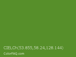 CIELCh 53.855,58.24,128.144 Color is a normal green color and the nearest color is Maximum Green #5e8c31. Hex code #578f2a and RGB value is rgb(87,143,42). In RGB color space, this color is composed of 34% red, 56% green, 16% blue, In CMYK color space, this color is composed of 39% cyan, 0% magenta, 71% yellow , 44% black , In HSL color space, this color has a hue angle of 93° , 55% saturation and 36% lightness.