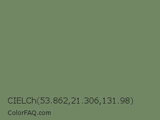 CIELCh 53.862,21.306,131.98 Color is a normal green color and the nearest color is Highland #6f8e63. Hex code #728765 and RGB value is rgb(114,135,101). In RGB color space, this color is composed of 45% red, 53% green, 40% blue, In CMYK color space, this color is composed of 16% cyan, 0% magenta, 25% yellow , 47% black , In HSL color space, this color has a hue angle of 97° , 14% saturation and 46% lightness.