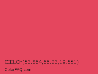 CIELCh 53.864,66.23,19.651 Color is a normal red color and the nearest color is Paradise Pink #e63e62. Hex code #e5465e and RGB value is rgb(229,70,94). In RGB color space, this color is composed of 90% red, 27% green, 37% blue, In CMYK color space, this color is composed of 0% cyan, 69% magenta, 59% yellow , 10% black , In HSL color space, this color has a hue angle of 351° , 75% saturation and 59% lightness.