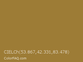 CIELCh 53.867,42.331,83.478 Color is a normal orange color and the nearest color is Metallic Sunburst #9c7c38. Hex code #9d7c36 and RGB value is rgb(157,124,54). In RGB color space, this color is composed of 62% red, 49% green, 21% blue, In CMYK color space, this color is composed of 0% cyan, 21% magenta, 66% yellow , 38% black , In HSL color space, this color has a hue angle of 41° , 49% saturation and 41% lightness.