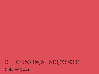 CIELCh 53.86,61.613,23.933 Color is a normal red color and the nearest color is Mandy #e25465. Hex code #de4f59 and RGB value is rgb(222,79,89). In RGB color space, this color is composed of 87% red, 31% green, 35% blue, In CMYK color space, this color is composed of 0% cyan, 64% magenta, 60% yellow , 13% black , In HSL color space, this color has a hue angle of 356° , 68% saturation and 59% lightness.
