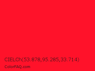 CIELCh 53.878,95.285,33.714 Color is a normal red color and the nearest color is Torch Red #fd0e35. Hex code #ff122a and RGB value is rgb(255,18,42). In RGB color space, this color is composed of 100% red, 7% green, 16% blue, In CMYK color space, this color is composed of 0% cyan, 93% magenta, 84% yellow , 0% black , In HSL color space, this color has a hue angle of 354° , 100% saturation and 54% lightness.