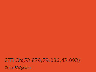 CIELCh 53.879,79.036,42.093 Color is a normal red color and the nearest color is Pomegranate #f34723. Hex code #e64a26 and RGB value is rgb(230,74,38). In RGB color space, this color is composed of 90% red, 29% green, 15% blue, In CMYK color space, this color is composed of 0% cyan, 68% magenta, 83% yellow , 10% black , In HSL color space, this color has a hue angle of 11° , 79% saturation and 53% lightness.