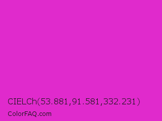 CIELCh 53.881,91.581,332.231 Color is a normal magenta color and the nearest color is Steel Pink #cc33cc. Hex code #e02acc and RGB value is rgb(224,42,204). In RGB color space, this color is composed of 88% red, 16% green, 80% blue, In CMYK color space, this color is composed of 0% cyan, 81% magenta, 9% yellow , 12% black , In HSL color space, this color has a hue angle of 307° , 75% saturation and 52% lightness.