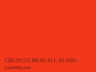 CIELCh 53.88,90.611,40.606 Color is a normal red color and the nearest color is Pomegranate #f34723. Hex code #f3371a and RGB value is rgb(243,55,26). In RGB color space, this color is composed of 95% red, 22% green, 10% blue, In CMYK color space, this color is composed of 0% cyan, 77% magenta, 89% yellow , 5% black , In HSL color space, this color has a hue angle of 8° , 90% saturation and 53% lightness.